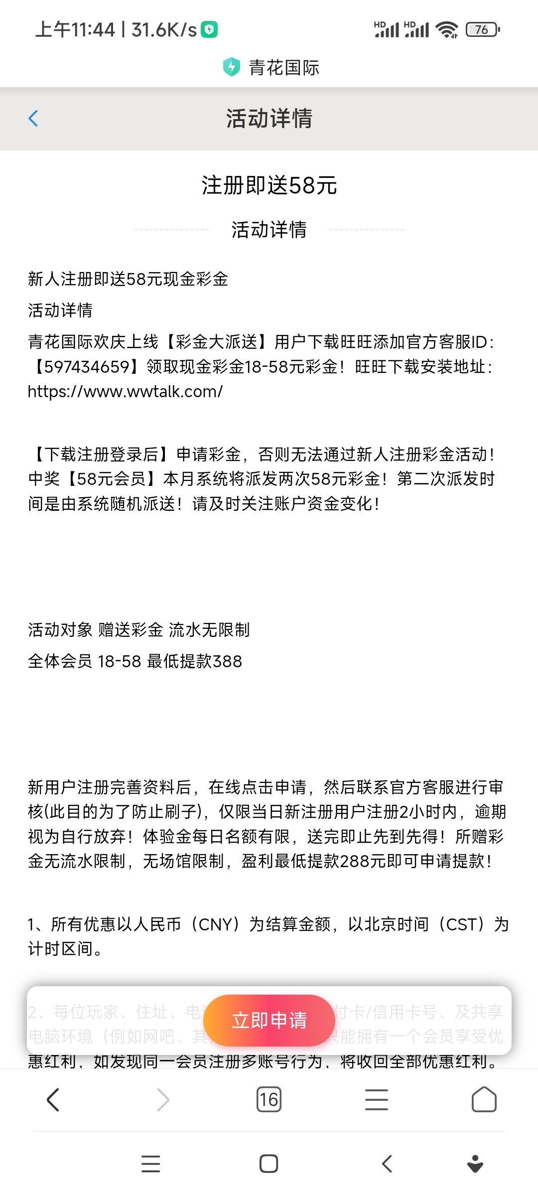 部分人注册就有,注册没有的活动自助申请http://qh66.me