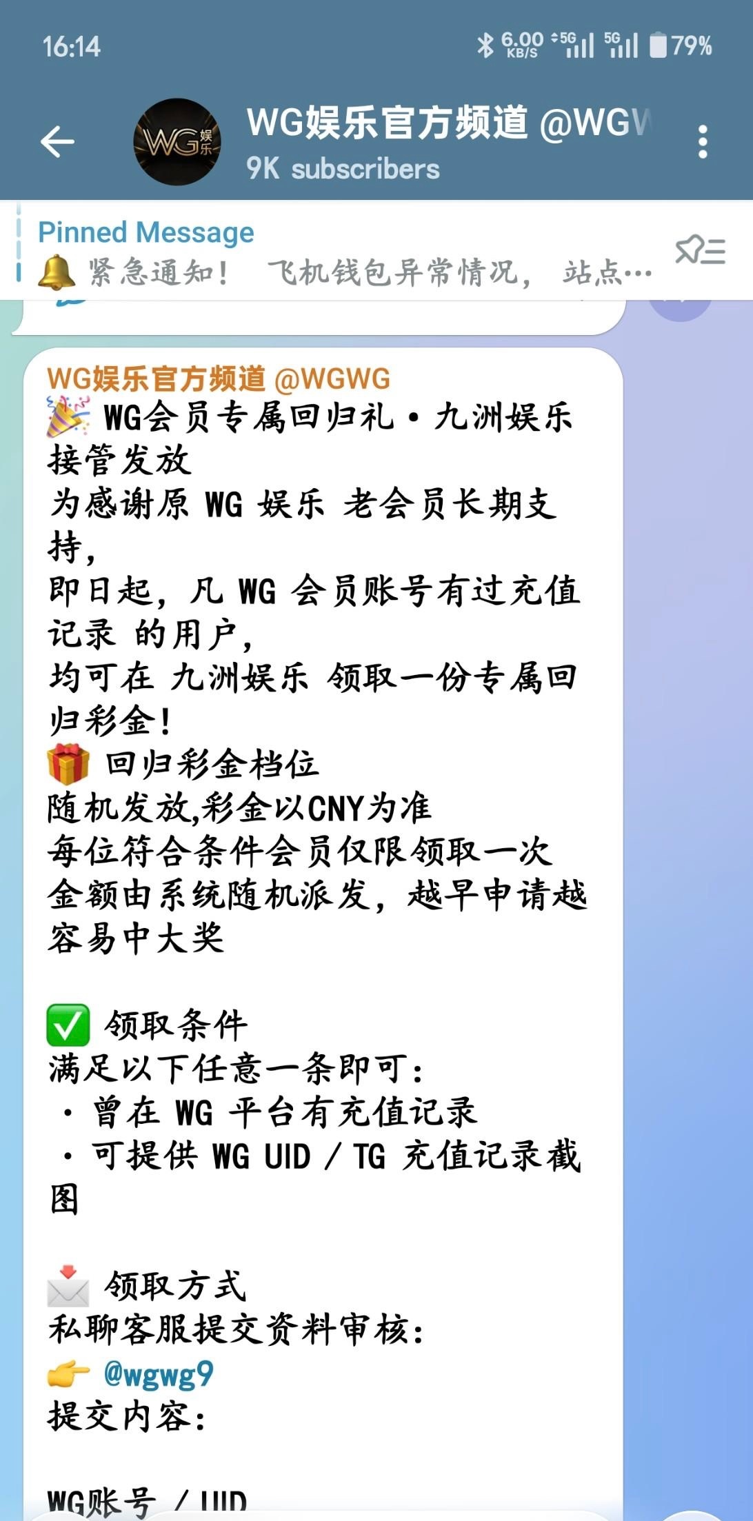 领取回归彩金就是那个之前经常抢红包的wg
