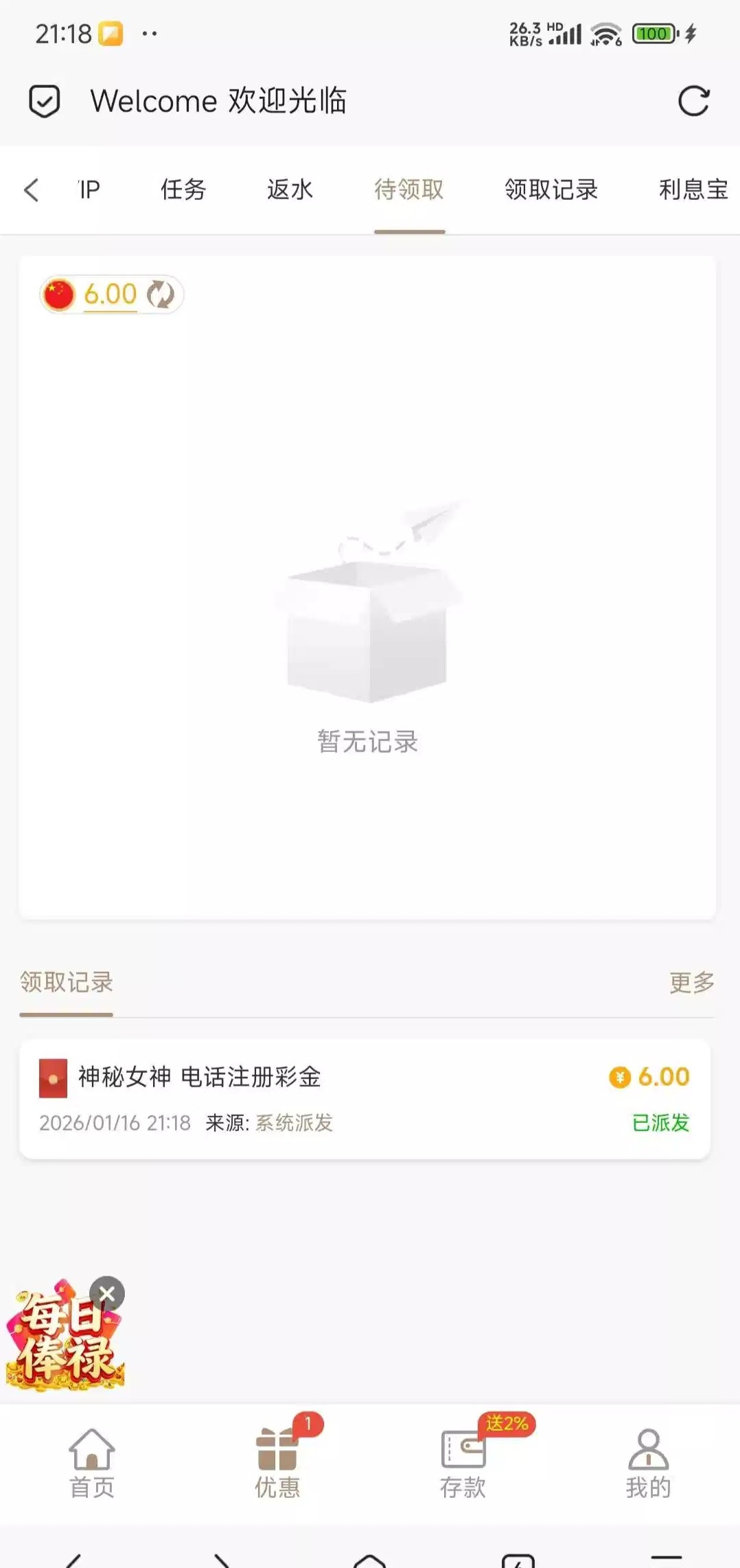 回访领到6块老哥们自己去看看有没有