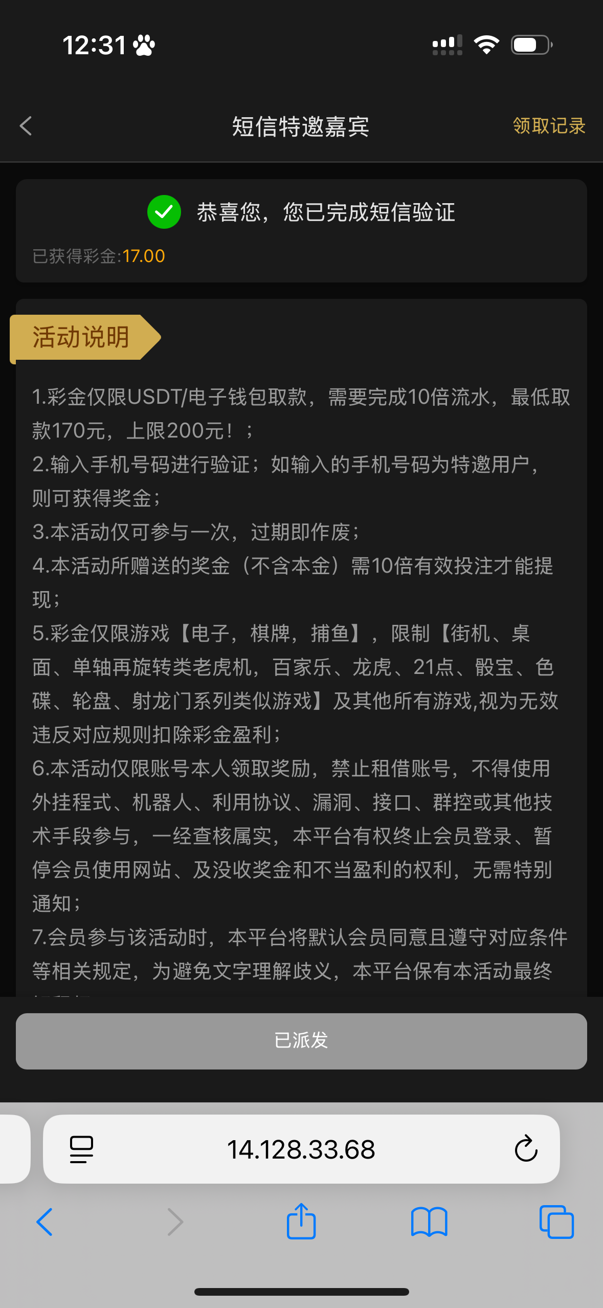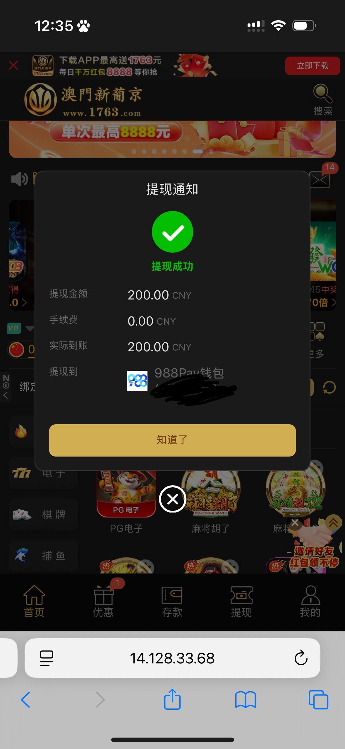 新普京1763短信特邀送17 没领过的可以去试试看我注册几天 今天就给我发短信了提现秒到